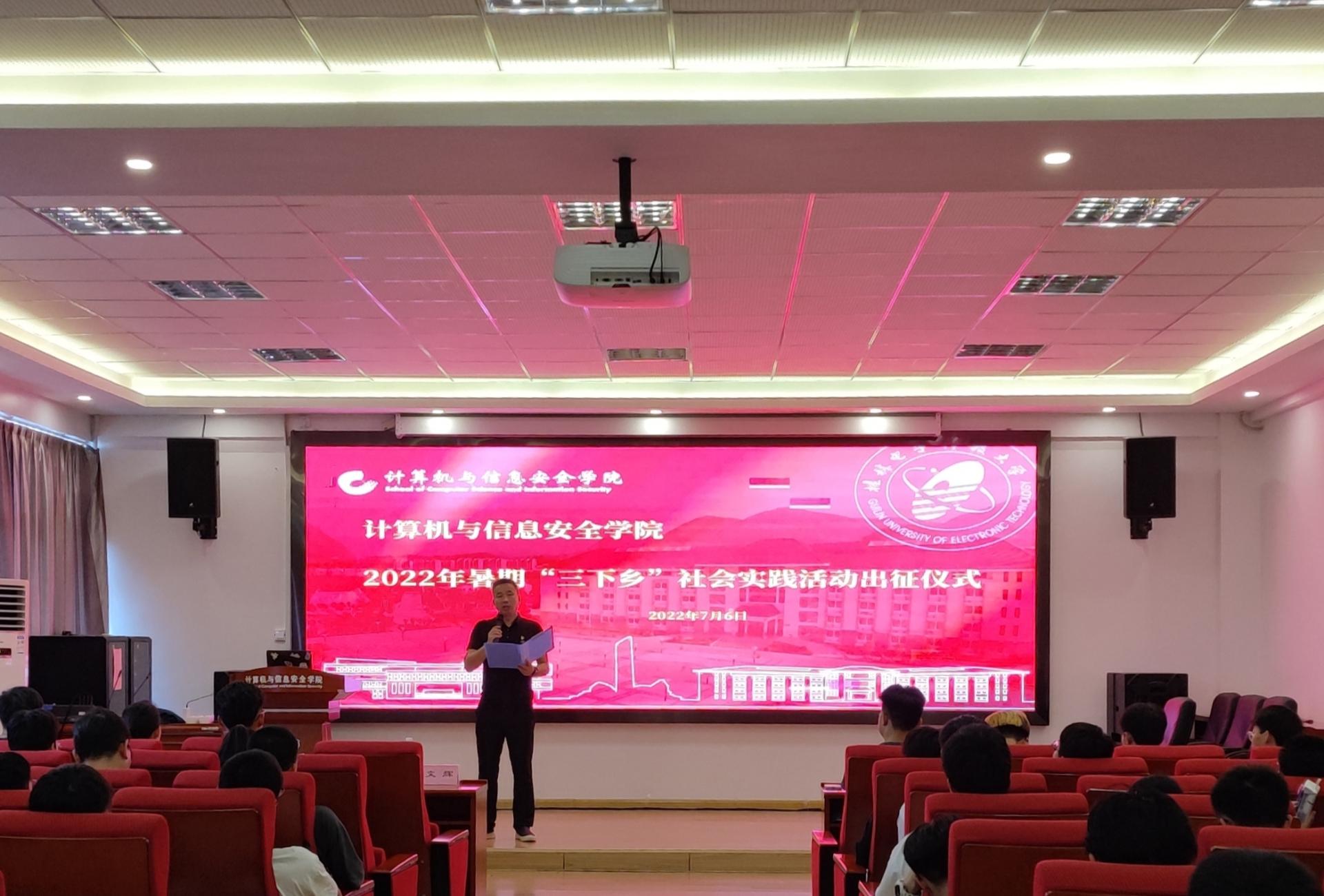 2022年7月6日中午,计算机与信息安全学院在5506会议室举行2022年暑期社会实践出征仪式。学院党委书记文辉、学院团委负责人成浩、各年级辅导员以及实践团队队长参加本次活动。