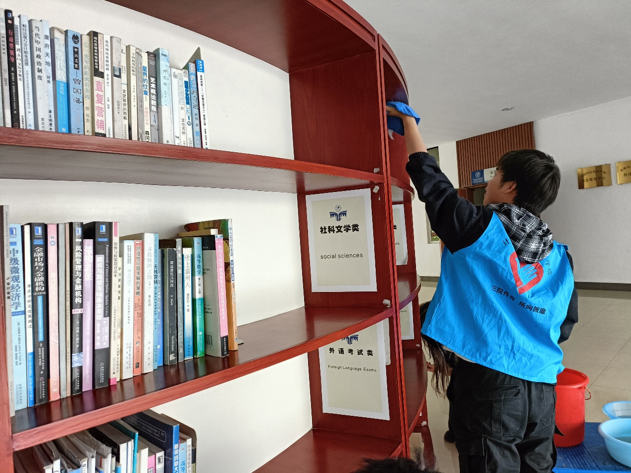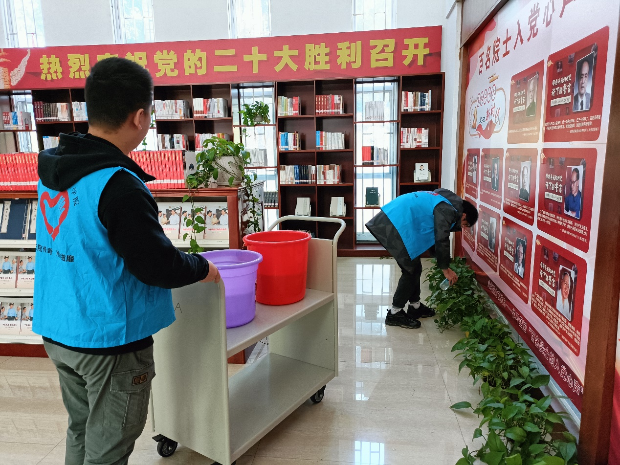 志愿者们对图书馆的环境卫生进行清扫,协助整理图书。通过本次主题党日活动不仅能让支部同学们更好地学习雷锋同志的无私奉献精神,还能在志愿服务活动中加强党性锻炼和党性修养,发挥党员的先锋模范、服务师生的作用。