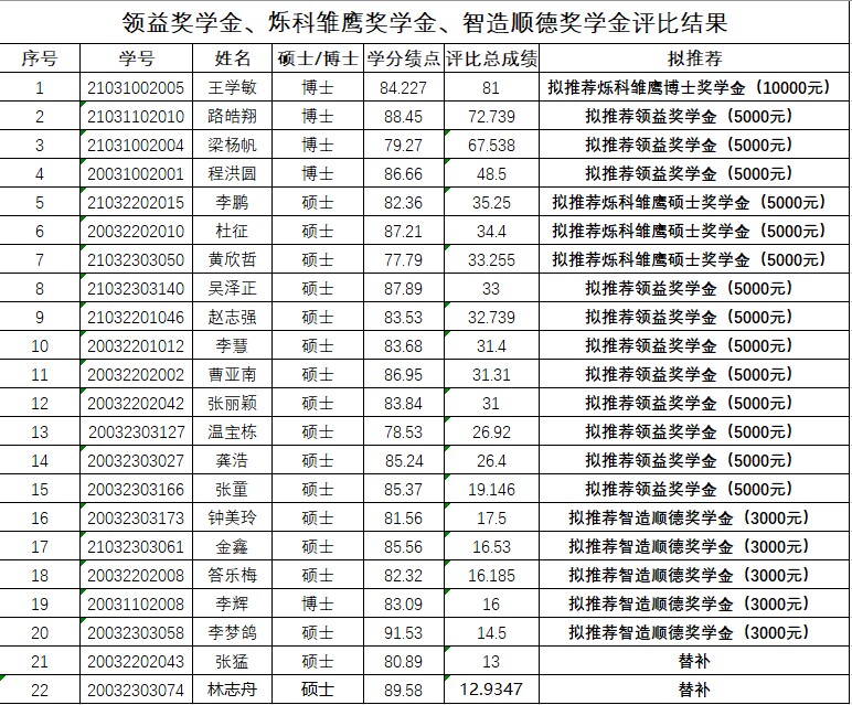 经本人申请,学院评审,根据申请人的得分情况,计算机与信息安全学院烁科雏鹰奖学金、领益奖学金、智造顺德奖学金拟推荐名单如下,如有异议,请在三个本周五下午17:30前实名反馈。联系人:杜华巍,联系电话:2291067,办公地点:金鸡岭校区3408、花江智慧谷1号楼404-1。