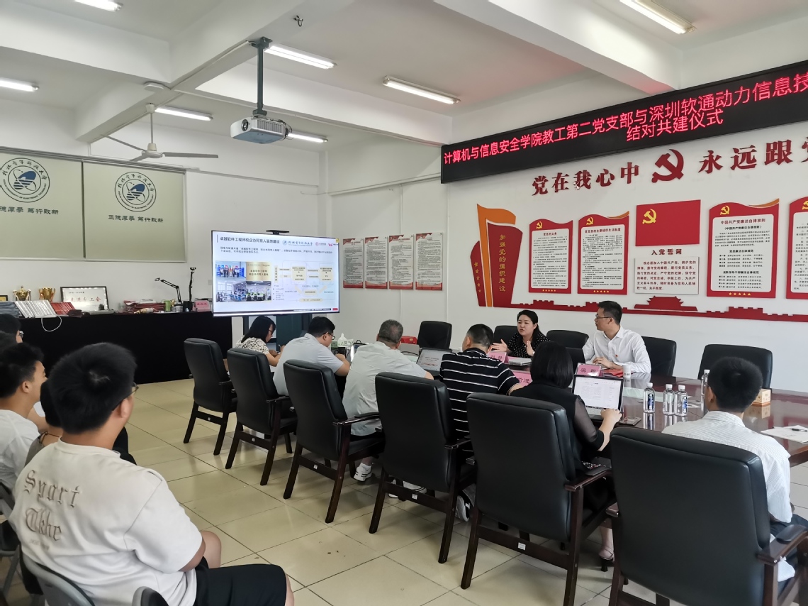 2023年6月6日,我院教工第二党支部与深圳软通动力信息技术有限公司服务运营党支部开展结对共建活动。活动由教工第二党支部书记危前进主持,深圳软通动力信息技术有限公司运营服务党支部书记刘静,教工第二党支部教师代表以及本科生软件工程专业党支部党员代表参加活动,学院党委书记文辉、副书记刘堂宇出席活动。