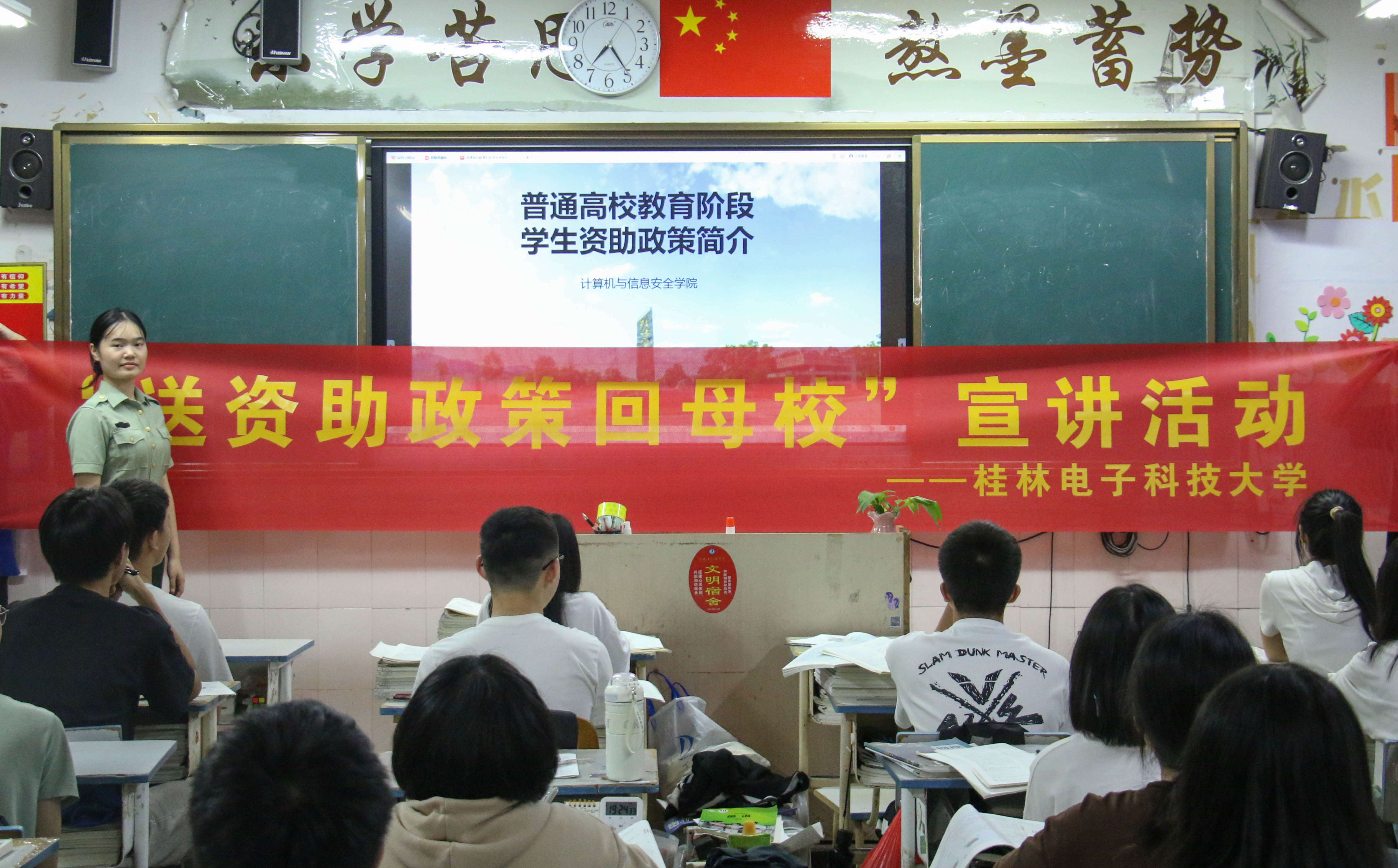 为加大学生资助宣传力度,扩大宣传效果。5月12日,学院2022级本科生、退役士兵黄玉燕回到母校永福县高级中学开展资助政策宣传,将国家资助、广西资助、桂电学生资助政策送回母校。