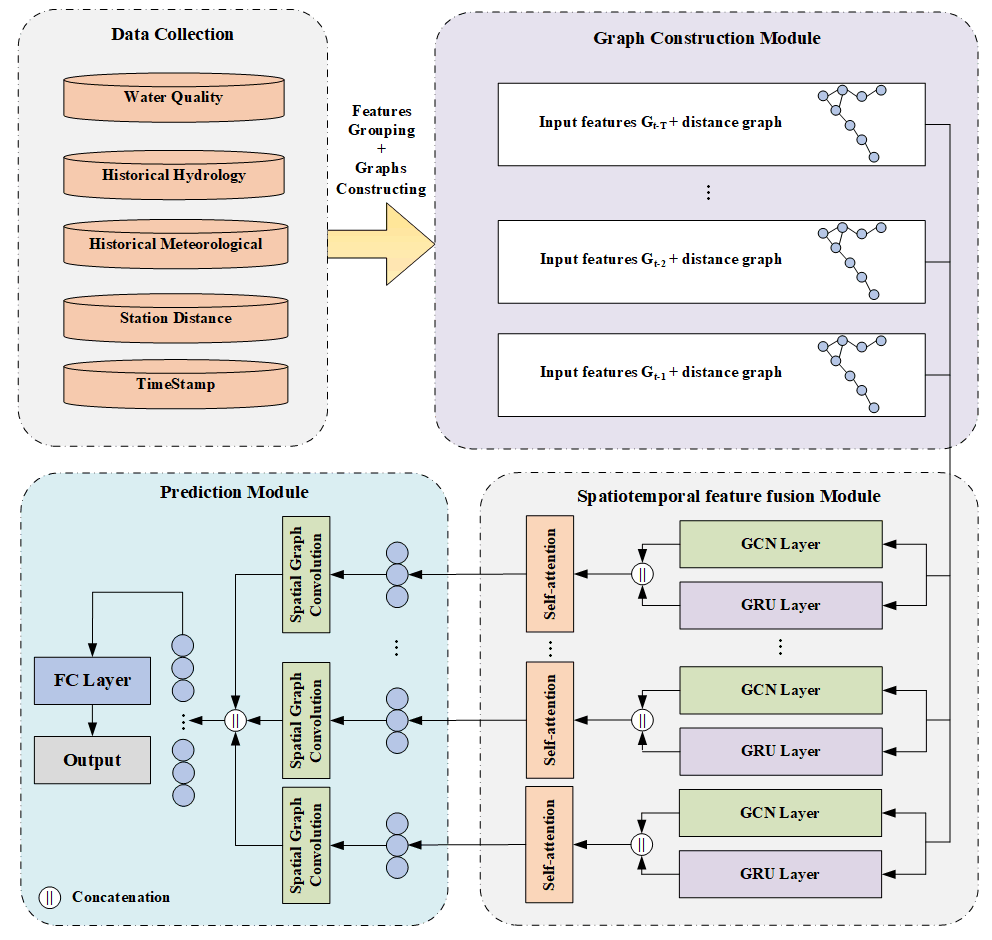 深度学习方法已广泛应用于水质预测,在处理高度非线性关系表现出强大能力。然而,现有研究大多集中于单个站点的水质预测,往往忽视了污染物在自然水体中的空间扩散和传播特性。空间点位水质演变过程受多个站点间复杂的空间与时间过程影响,忽略空间交互作用可能会影响模型在实际应用中的扩展性和稳定性。鉴于图神经网络在捕捉空间结构信息方面的优势,本文设计了一种基于图神经网络的深度学习模型(STF-GNN),用于水质数据的时空特征提取与预测。模型将监测站及邻接关系建模为图的节点与边,从而将站点的分布视为图网络。通过结合图卷积网络(GCN)、门控循环单元(GRU)和Self-attention机制,该模型能够有效捕获空间点位水质时间序列数据中的多尺度时空特征。最后,基于空间图卷积和全连接网络的预测模块对空间点位的水质进行预测。