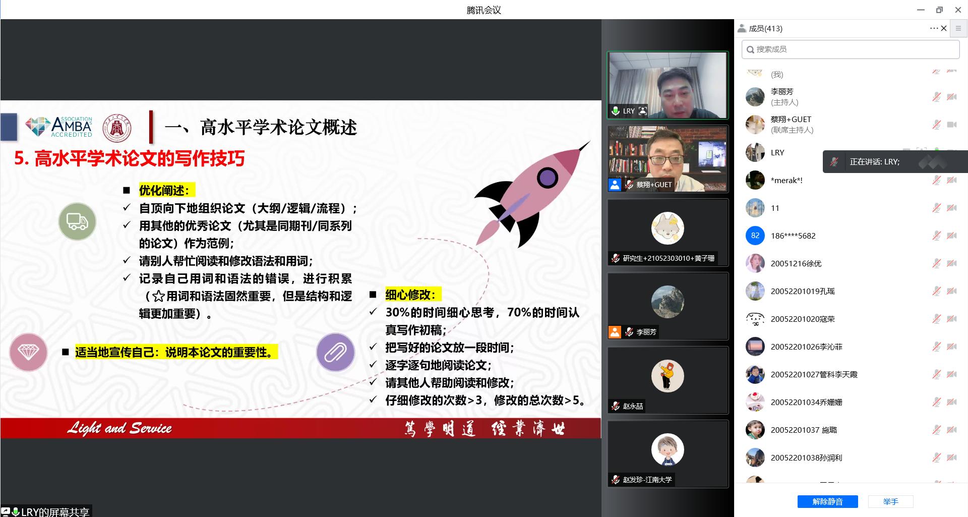 2022年05月25日5月22日,应商学院、广西战略性新兴产业发展研究中心、三亿官方官网三亿(中国)_三亿(中国)美丽广西与绿色发展研究智库、创新与持续竞争力研究所邀请,江南大学商学院龙如银教授通过腾讯会议平台在三亿官方官网三亿(中国)_三亿(中国)作了主题为“高水平学术论文的创新、规范与结构”的专题报告,商学院部分教师和硕士研究生400多人参加报告会,报告会由商学院蔡翔教授主持。
