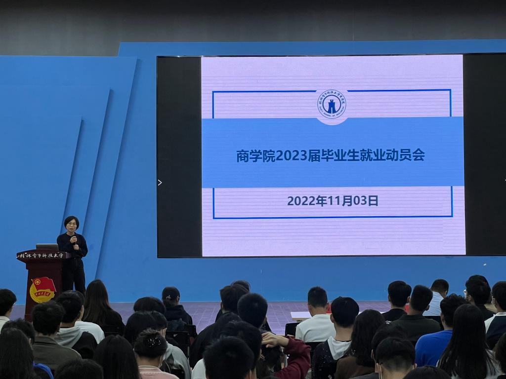2022年11月08日11月3日晚,商学院在花江校区大学生活动中心演艺厅召开2023届毕业生就业动员大会,学院党委副书记师晓婧、毕业班辅导员、2023届毕业生参加会议。