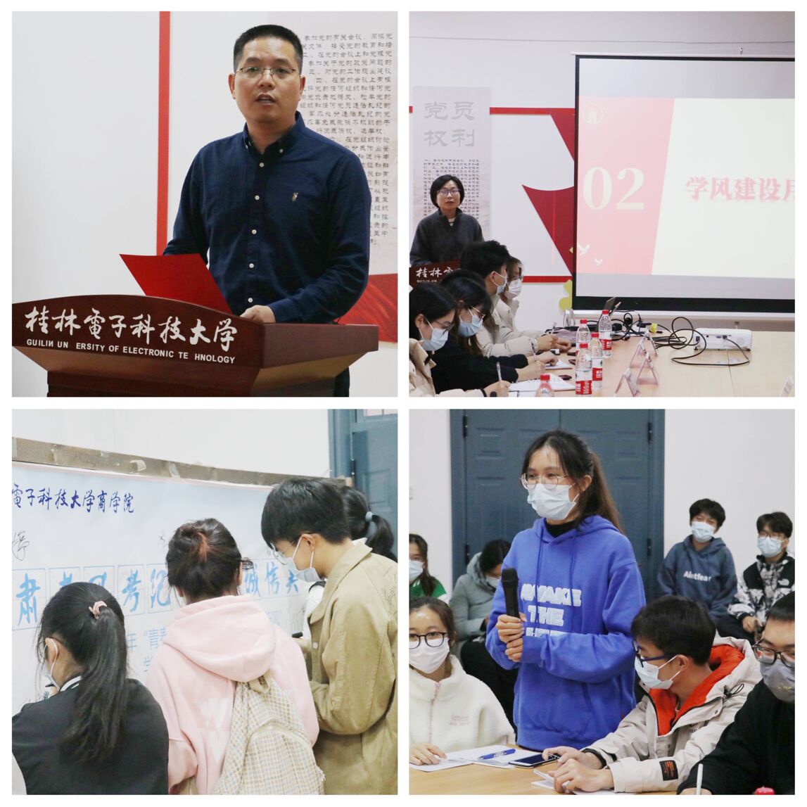 张发明为活动致辞,并结合“学风优先”“全员参与”“责任落实”等方面对学风建设月活动提出了要求和期望,希望同学们深入学习领会党的二十大精神,发扬青年力量,从自身做起,培养自学能力和创新能力,营造优良学风。师晓婧介绍了学风建设月的八大系列活动,花均南为同学们做考试动员,学生代表做表态发言。参会人员共同学习了“严肃考纪、整顿考风”活动倡议书,参与了诚信考试签名倡议活动。活动最后,与会人员就学院学风建设、自身学习、生活等方面开展了学生干部座谈会。