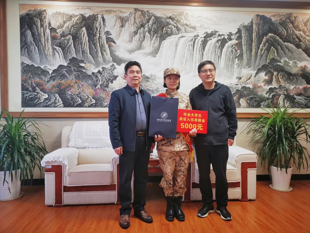 朱小精为李文哲颁发奖励金并赠送纪念品,同时勉励她要秉承“正德厚学、笃行致新”的校训,弘扬“艰苦创业、自强不息”的桂电精神,扎根、奉献、立功军营,争做一名业务精湛、军事过硬、作风优良的新时代军人。