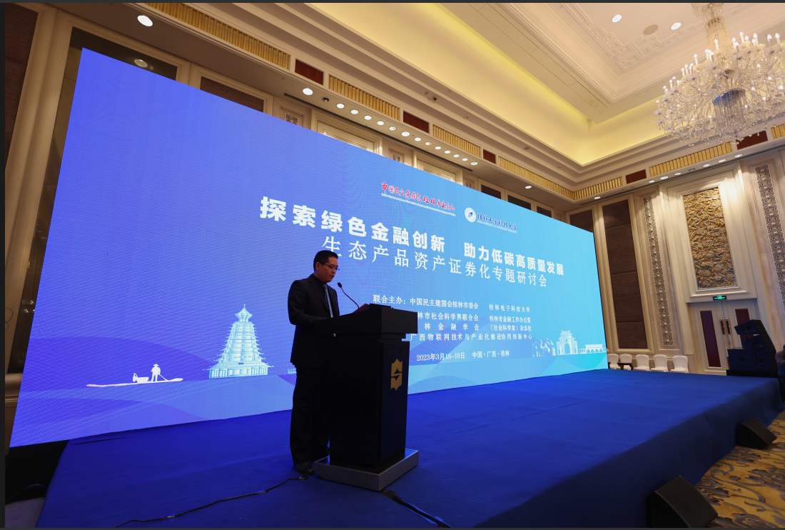 研讨会上,郑毅在主题报告环节以《建立健全生态产品价值实现机制 探索“两山”理论实践路径》为题作第一发言。针对桂林及西部地区的生态资源优势和生态发展特点,提出大胆探索生态金融创新、推进和尝试碳汇交易及生态产品资产证券化、建立健全生态产品价值实现机制的建议。