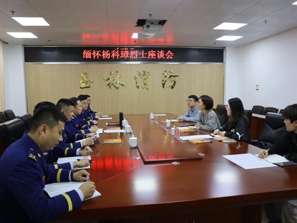 随后,师晓婧副书记一行前往玉林市消防救援支队开展“缅怀杨科璋烈士”座谈会,双方就如何传承弘扬杨科璋烈士精神进行深入探讨交流,并就玉州区消防救援大队党委、商学院党委联建共建达成初步意向,同时希望在杨科璋烈士纪念馆、消防自动警报系统建设上开展深度校队合作。宫玉郡政委希望广大同学、消防指战员,一要学习英雄,铭记初心;二要崇尚英雄,校队联动;三要争当英雄,为国为民。师晓婧副书记表示,本次座谈意义重大,坚定校队合作的决心,并希望在党建共建、团建共建、消防援学、毕业生拓岗等方面建立长效合作机制。