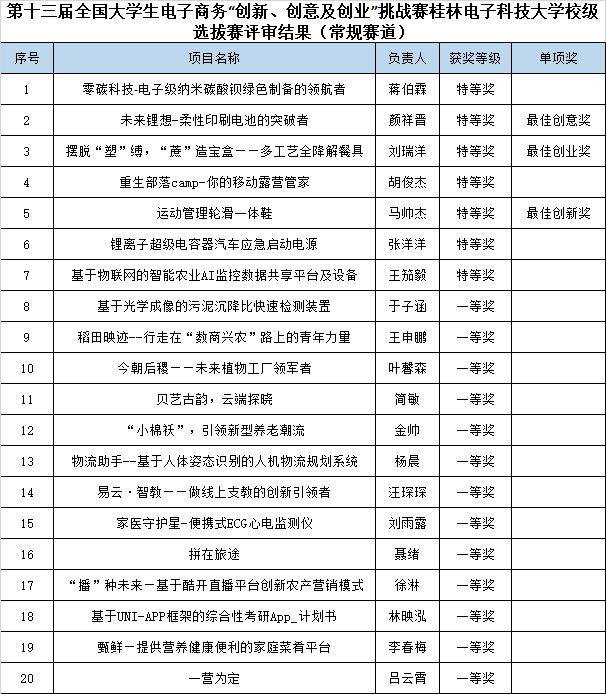 2023年04月11日经过网络初评及现场答辩,有92支队伍分别获得特等奖、一等奖、二等奖及三等奖(20支队伍参加现场赛),现将第十二届电子商务“三创赛”校级赛评审结果公示如下:公示期3天,如有异议,请联系张学翠,电话2191500。公示期满,上报校级赛结果至省级赛。