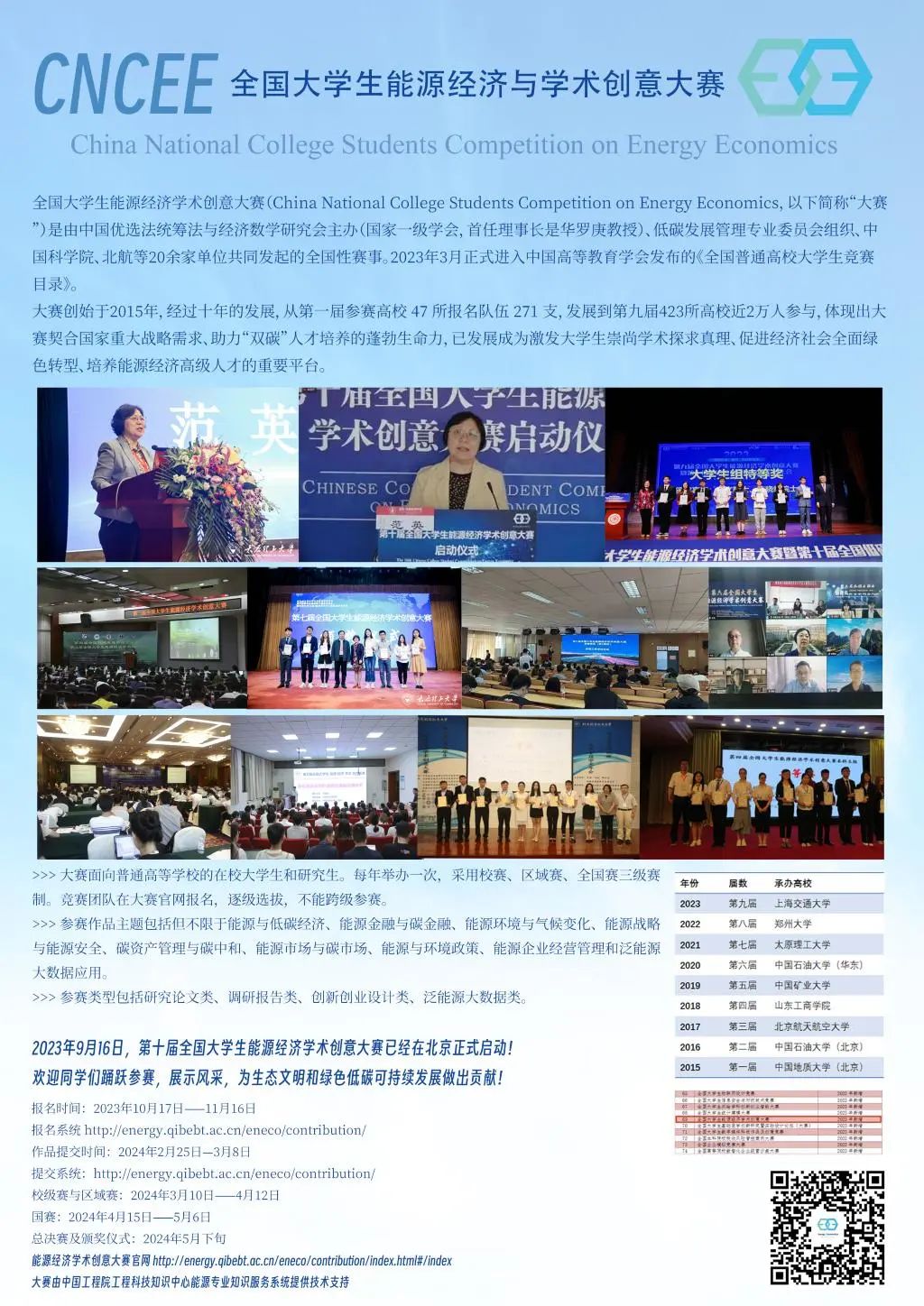 大赛创始于2015年,由中国“双法”研究会低碳发展管理专业委员会牵头,由20余所高校和科研机构联合发起。经过十年的发展,全国大学生能源经济学术创意大赛已经成为响应国家重大战略需求、助力“双碳”人才培养的重要赛事,激发大学生创新意识、启迪创新思维、提升创造能力提供梦想起飞的平台。随着2023年大赛跻身全国普通高校大学生竞赛排行榜,第十届全国大学生能源经济学术创意大赛的参与度和影响力都将实现跨越式发展。欢迎同学们踊跃参赛,展示风采,为生态文明和绿色低碳可持续发展做出贡献!