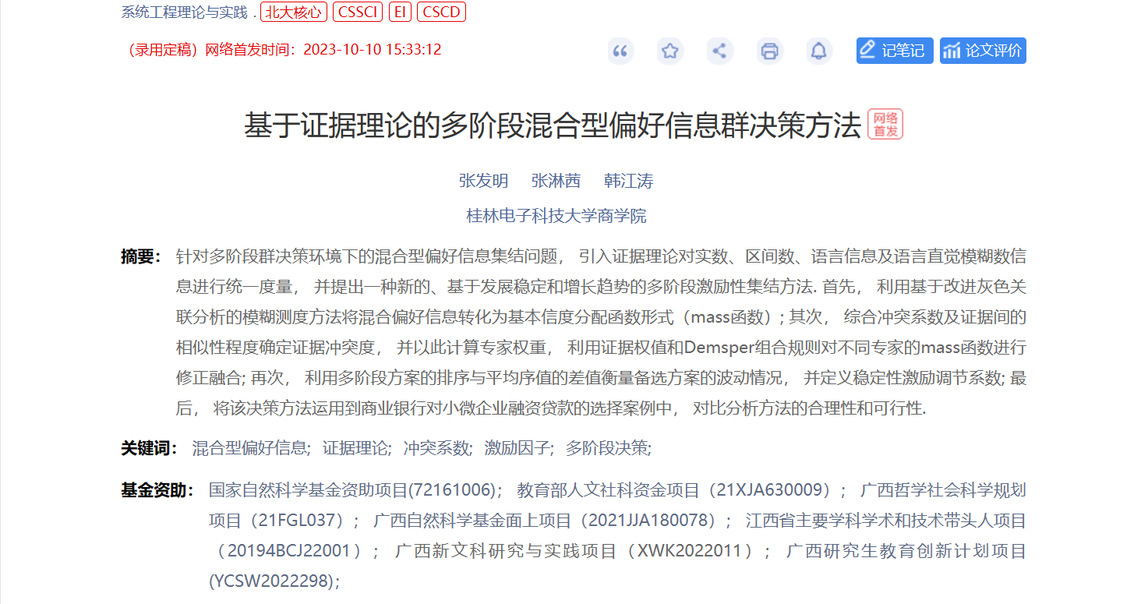 2023年10月29日近日,商学院管理科学与工程专业2021级研究生张淋茜在国家自然科学基金委管理科学部认定A类期刊、FMS目录T1期刊的《系统工程理论与实践》发表题为“基于证据理论的多阶段混合型偏好信息群决策方法”的高水平论文,导师张发明是第一作者,三亿官方官网三亿(中国)_三亿(中国)为该论文第一完成单位。研究受到国家自然科学基金资助项目(72161006)、 教育部人文社科资金项目(21XJA630009)、广西哲学社会科学规划项目(21FGL037)、 广西自然科学基金面上项目(2021JJA180078)、江西省主要学科学术和技术带头人项目(20194BCJ22001)、 广西新文科研究与实践项目(XWK2022011)、广西研究生教育创新计划项目(YCSW2022298)的支持。