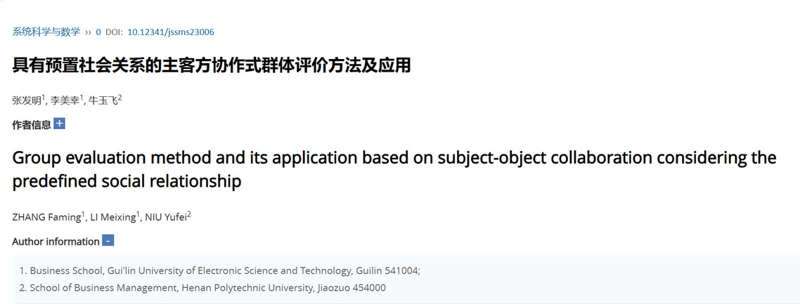 2023年10月29日近日,商学院管理科学与工程专业2021级研究生李美幸在FMS管理科学高质量期刊的中文T2类期刊《系统科学与数学》发表题为“具有预置社会关系的主客方协作式群体评价方法及应用”的高水平论文,导师张发明是第一作者,三亿官方官网三亿(中国)_三亿(中国)为该论文第一完成单位。研究受到国家自然科学基金资助项目(72161006)、教育部人文社科资金项目(21XJA630009)、广西哲学社会科学规划项目(21FGL037)、广西自然科学基金项目(2021JJA180078)、江西省主要学科学术和技术带头人项目(20194BCJ22001)、广西新文科研究与实践项目(XWK2022011)的支持。