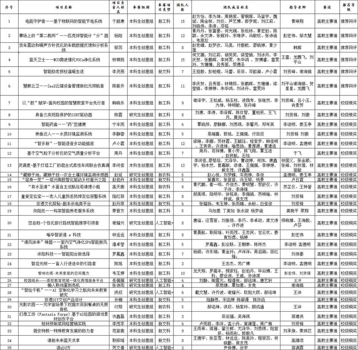 中国国际大学生创新大赛(原互联网+)商学院院级赛经过网评及现场赛,商学院共有35个项目获得奖项,其中有6项推荐网评,13项获得校级银奖,16项获得校级铜奖,现将拟推荐获奖项目具体情况进行公示(如下图所示)。公示期为2天,如有异议,请联系学院办公室张学翠老师(电话:2316475)公示期满,拟推荐结果将上报学校。