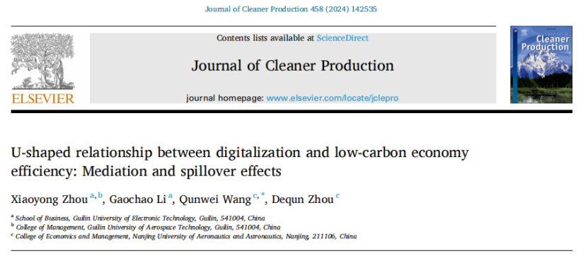 2024年10月14日近日,商学院管理科学与工程专业2022级研究生李高超在中科院一区TOP 期刊《Journal of Cleaner Production》(SCI影响因子为9.7)发表题为“U-shaped relationship between digitalization and low-carbon economy efficiency: Mediation and spillover effects”的高水平论文,导师周小勇教授是第一作者,三亿官方官网三亿(中国)_三亿(中国)为该论文第一完成单位。