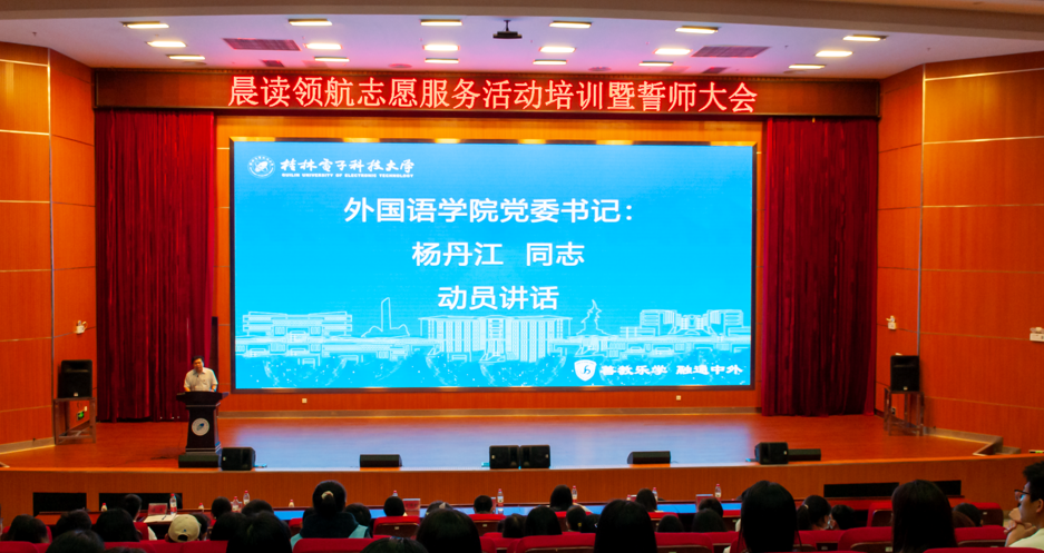 5月13日下午,外国语学院协同晨读领航志愿者协会在花江校区图书馆报告厅召开晨读领航志愿服务活动培训暨誓师大会。外国语学院党委书记杨丹江、晨读领航各试点学院辅导员、全体晨读指导教师、晨读领航志愿者和班级负责人出席大会,大会由外国语学院党委副书记段筱雨主持。