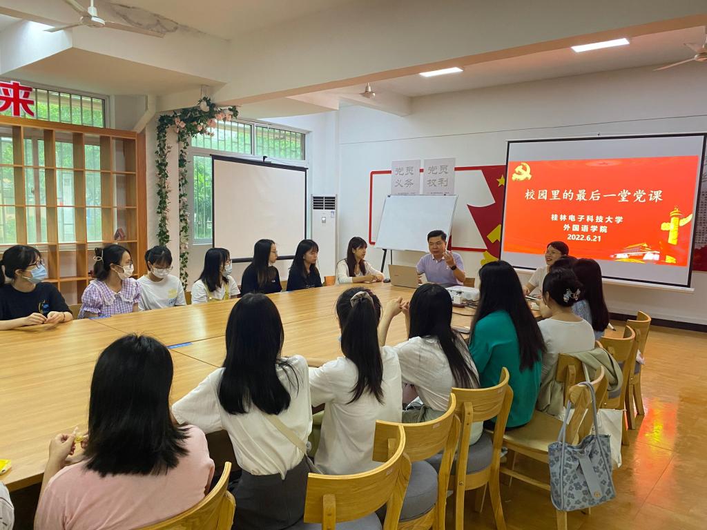 6月21日下午,外国语学院在学生社区D区25栋101党团之家举行“毕业生校园里的最后一堂党课”,由学院党委书记杨丹江授课,党委副书记段筱雨、全体辅导员和18级毕业生党员参加党课学习。