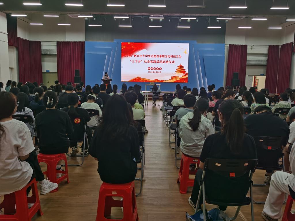 6月24日下午,外国语学院在大学生活动中心一楼演艺厅举行2022年广西大学生志愿者暑期文化科技卫生“三下乡”社会实践活动启动仪式,学院党委副书记段筱雨、辅导员屈玉洁、团委副书记黄华静、2019级学生代表张馨心及2020级全体学生参加启动仪式,仪式由屈玉洁主持。