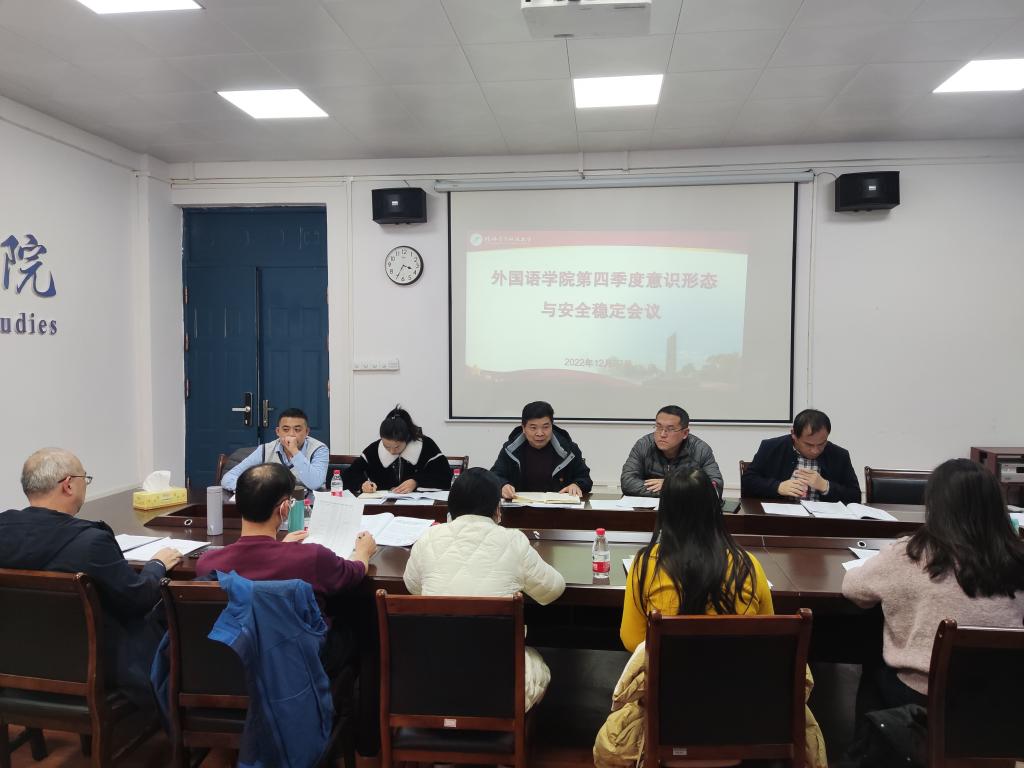 12月7日,外国语学院在花江校区3408会议室召开第四季度安全稳定暨意识形态工作专题研判会。会议由学院党委书记杨丹江主持,学院领导班子成员、党委委员、各支部书记参加会议。