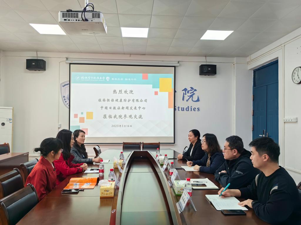 3月16日下午,中国日报社新闻发展中心广西区主任李梓瑜,桂林恒保健康防护有限公司总经理总助覃君艳、 研发中心负责人兰黄鲜 一行来学院交流,学院院长黄宇元、学院党委副书记耿建亮、学院副院长汪庆华以及毕业班辅导员参加座谈。