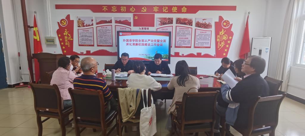 3月22日,外国语学院党委在花江校区第三教学楼3506会议室召开全面从严治党暨全面深化清廉校园建设工作会议。会议由学院党委书记杨丹江主持,学院班子成员、党委委员、全体党支部书记参加会议。