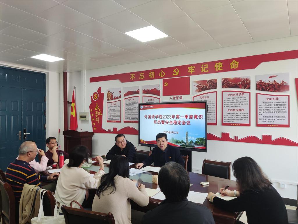 近日,外国语学院在花江校区3506党员活动室召开第一季度意识形态暨安全稳定专题研判会。会议由学院党委书记杨丹江主持,学院班子成员、党委委员、支部书记参加会议。