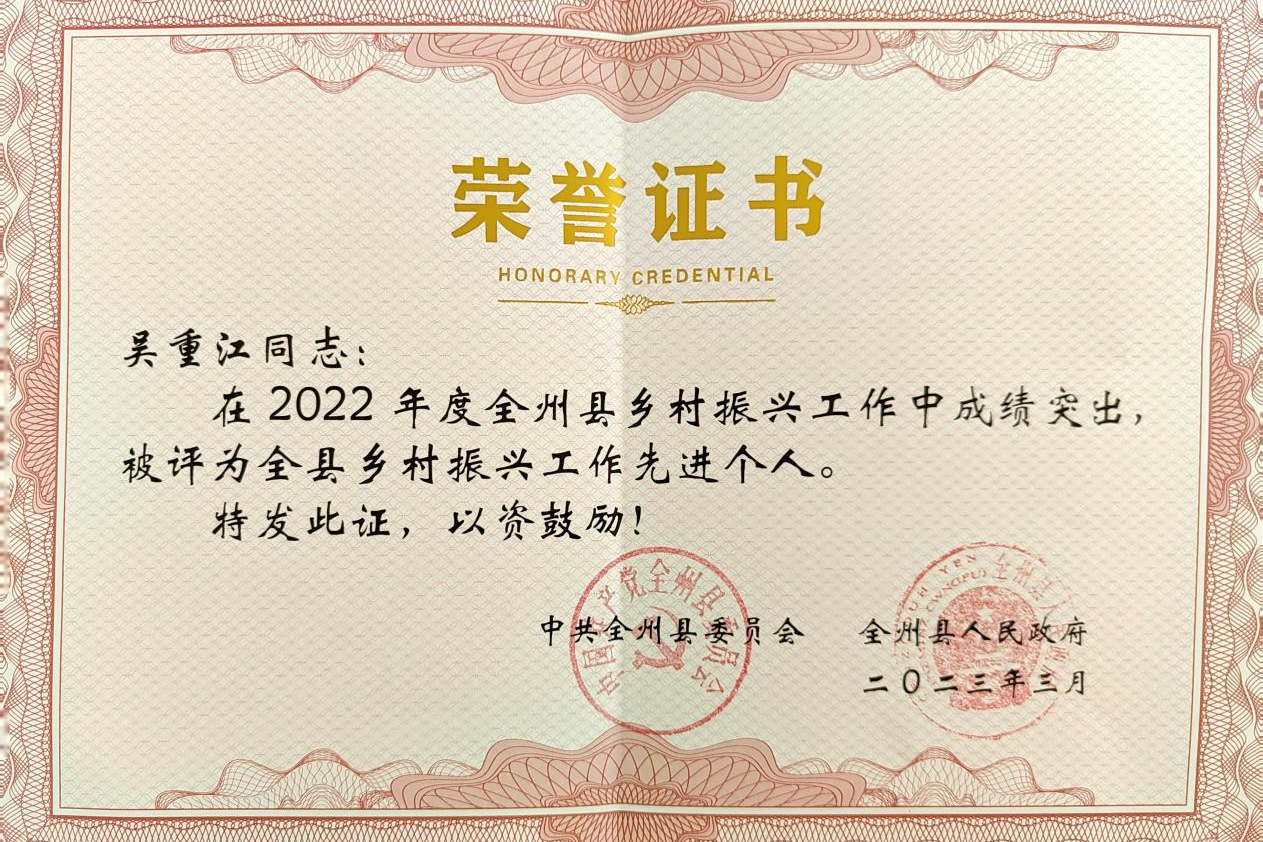 近日,全州县实施乡村振兴战略指挥部对2022年全县乡村振兴工作先进集体和先进个人进行了通报表扬。我院选派驻全州县两河镇上刘村吴重江获评“全州县乡村振兴工作先进个人”荣誉称号。