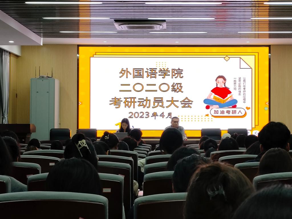 2023年4月10日晚,外国语学院在花江校区第三教学楼3305会议室举行考研动员大会。外国语学院党委副书记耿建亮、辅导员屈玉洁和2020级全体学生参加会议。