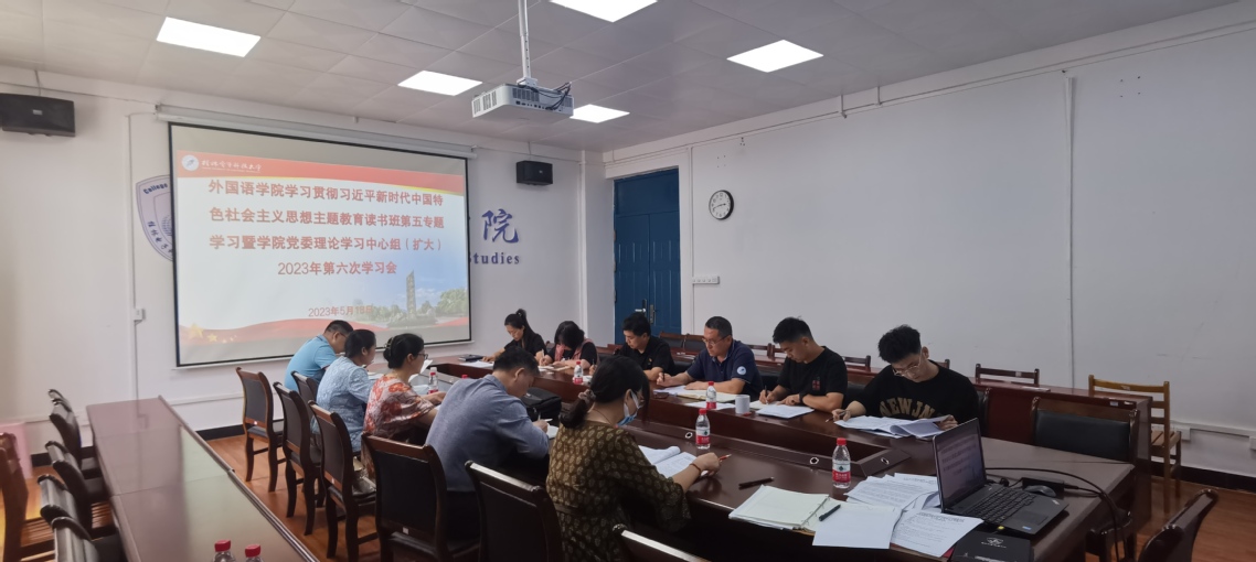 5月18日下午,外国语学院学习贯彻三亿官方官网三亿(中国)_三亿(中国)新时代中国特色社会主义思想主题教育读书班第五专题学习暨学院党委理论学习中心组(扩大)2023年第六次学习会在花江校区第三教学楼408会议室举行。学院党委委员、领导班子成员、党支部书记参加会议,会议由学院党委书记杨丹江主持。