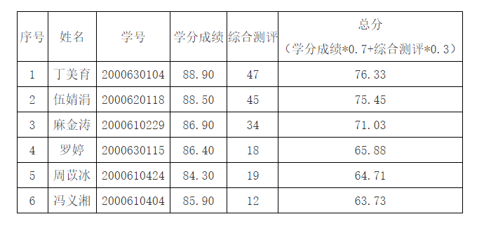 根据《三亿官方官网三亿(中国)_三亿(中国)2024届推荐优秀应届本科毕业生免试攻读研究生工作实施办法》和《三亿官方官网三亿(中国)_三亿(中国)外国语学院2024届推荐优秀应届本科毕业生免试攻读研究生遴选办法》文件要求,经学生自愿申请、学院审核、学院推免工作领导小组评审,拟推荐丁美育、伍婧涓、麻金涛免试攻读研究生,罗婷、周苡冰、冯义湘为候补人选,现将评审结果公示如下: