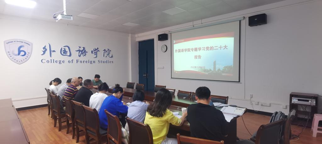 10月21日,外国语学院党委理论学习中心组在花江校区第三教学楼3408会议室召开本年度第五次学习会,专题学习党的二十大报告。会议由学院党委书记杨丹江主持,学院全体党委委员、支部书记参加会议。