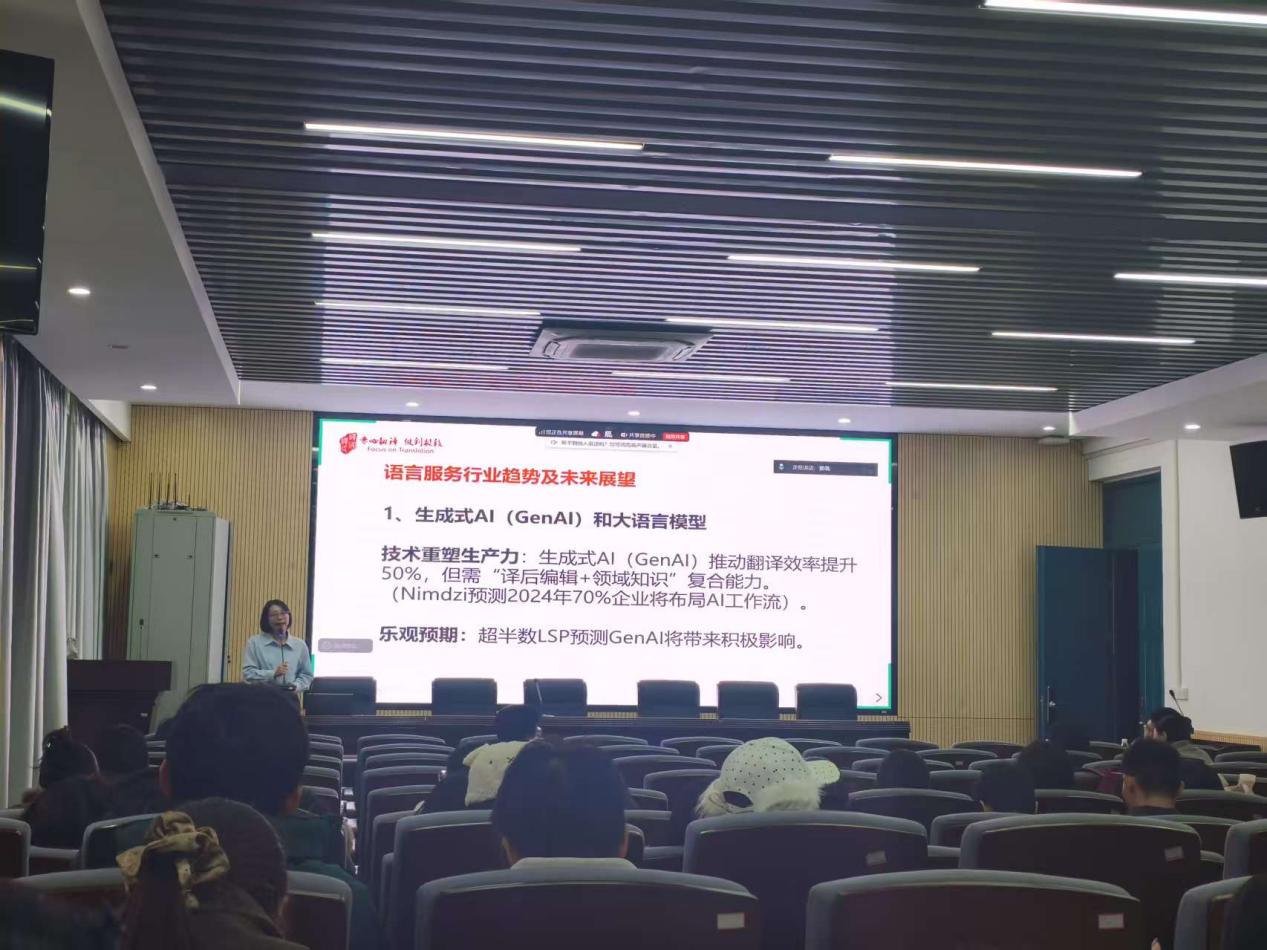 11月18日,第47期“花江语坛”在我院3305报告厅成功举办。本期论坛特邀译国译民翻译公司资深翻译专家洪细梅博士担任主讲,以“AI数字+时代的语言服务:变革、机遇与职业突破”为主题,深入阐释了人工智能为语言服务行业带来的创新动力与发展前景。讲座结束后,全峰副院长作了总结发言。本次讲座吸引了相关教师与学院全体研究生的积极参与。