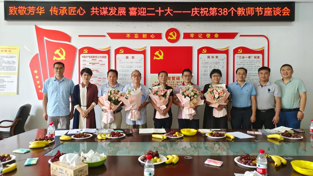 9月9日上午,数学与计算科学学院党委在学院党员活动室举办“致敬芳华 传承匠心 共谋发展 喜迎二十大”——庆祝第38个教师节教师座谈会,学院领导班子成员、工会主席、入职20年以上的老教师代表参加座谈会。