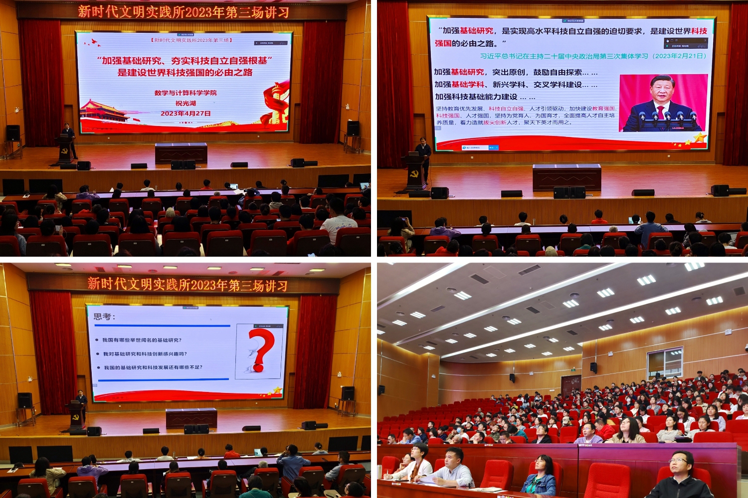 4月27日,由校党委宣传部主办、数学与计算科学学院承办的“新时代文明实践所”2023年第三场理论宣讲活动在花江校区图书馆三楼报告厅以线上线下方式同步举行。活动邀请数学与计算科学学院副院长祝光湖担任主讲,各学院师生党员代表、发展对象、入党积极分子以及学生代表260余人参加活动。