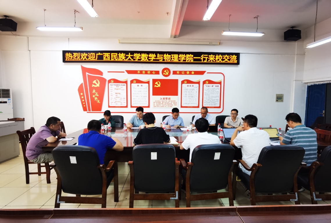 6月1日下午,广西民族大学数学与物理学院书记韦志江一行到数学与计算科学学院调研交流,学院党委书记龙雪梅热情接待了韦志江一行。学院领导、系室主任及研究生秘书参加了本次座谈会。