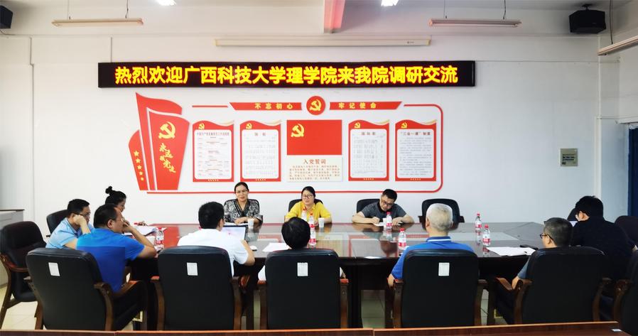 6月19日下午,广西科技大学理学院副院长庞建华、霍海峰一行到我院调研交流。院长刘期怀、教学副院长李郴良、吴孙勇,各系室负责人以及教学秘书参加了本次座谈会,会议由刘期怀主持。