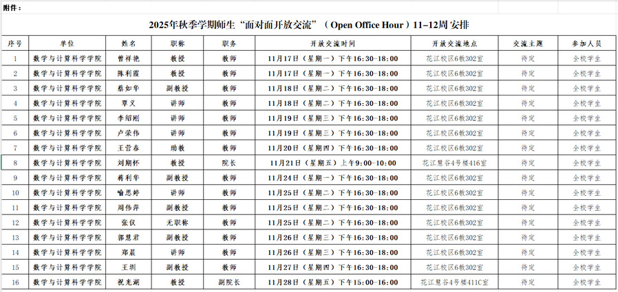 根据学校关于实施师生“面对面开放交流”(Open Office Hour)制度的通知,结合我院实际情况,现将数学与计算科学学院师生“面对面开放交流”(第11-12周)安排表予以公告。交流内容涵盖课程辅导答疑、学业发展规划、专业发展指导、预警学业帮扶、心理咨询辅导、校园文体活动及社会实践指导等多个方面,欢迎全校学生积极参与交流。