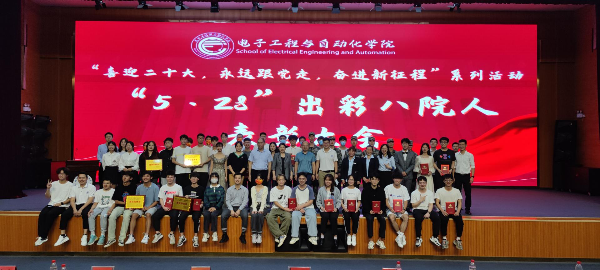 5月28日下午,电子工程与自动化学院在花江大礼堂举行“喜迎二十大、永远跟党走、奋进新征程”系列活动之“5·28”出彩八院人表彰大会,周娅副校长、学院领导、老师代表、各年级辅导员及学生代表共600余人参加。本次活动共设置了良师益友奖、最受欢迎阿姨奖、笃志好学奖等11个奖项。