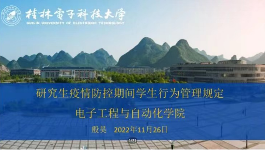 11月26日,电子工程与自动化学院召开疫情防控期间研究生行为管理规定会议,因疫情原因,此次会议线上召开,全体在校研究生参加会议。会上,研究生辅导员强调,现在是特殊时期,更是困难时期,需要同学们的理解支持与配合,希望大家能遵守相关规定、团结一致、共克时艰,战胜疫情。