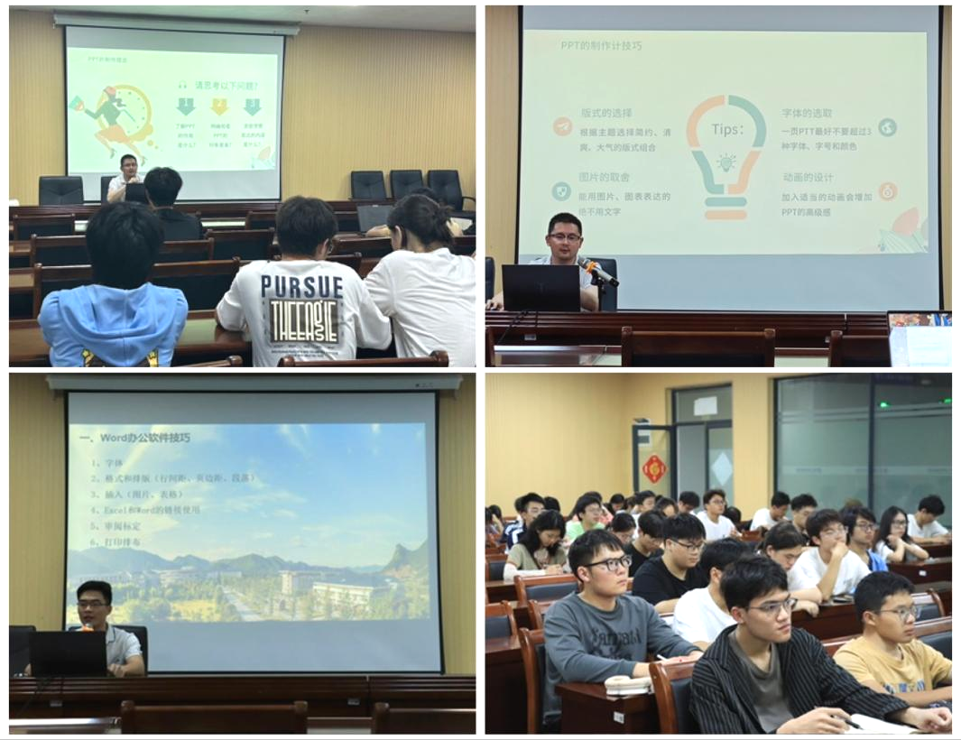 会上,孙千峰结合学生干部日常工作的需求,围绕PPT制作的理念、技巧、步骤及注意事项四个方面为学生进行授课。覃福龙介绍了Word文档中的基础实用技能,详细讲解了Excel的单元格格式设置、公示和函数快捷用法,通过详细的操作步骤演示帮助学员们提高办公软件的操作技能。