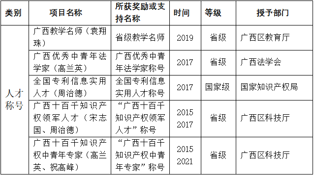 学院自主培养全国专利信息实用人才1人,广西教学名师1人,广西优秀中青年法学家1人,广西十百千知识产权领军人才2人,广西十百千知识产权中青年专家2人。这些优秀教师作为教学科研团队的骨干,为促进学院法学和知识产权师资队伍的整体发展起到了积极的带头作用。