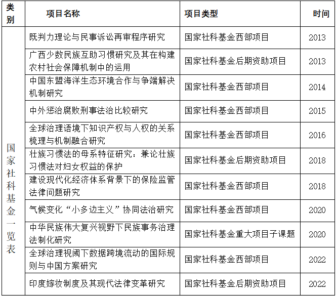 科学研究成果实现新突破 学院积极营造潜心钻研、创新进取的科学研究氛围,在理论研究、成果推广和科研育人等方面均取得了显著的成绩。2012年以前,学院共承担国家社科基金项目2项;截至2022年,学院共承担国家社科基金项目13项,十年内增加了11项(含国家社科重大项目子课题1项);2014年以来,学院共有22项成果获得广西社科优秀奖或中国法学会优秀奖,其中获得广西优秀社会科学成果奖一等奖1项,实现了学校广西社会科学优秀成果一等奖零的突破!