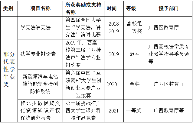 人才培养质量取得新成效 2012年,学院在读本科生400余人;2022年,在读本科生600余人、硕士生157人,另有知识产权辅修学位学生200余人。学生学风优良,到课率、毕业率、考研率和英语四级通过率等一直位居全校前列;学生积极参加国家级、广西区级各项专业竞赛,其中2人次获得全国学生“学宪法讲宪法”演讲比赛广西区赛区决赛一等奖,获得1次“八桂法声”法学专业辩论赛冠军,获得1项“互联网+”大学生创新创业大赛广西选拔赛金奖、1项挑战杯广西大学生课外科技作品竞赛一等奖。