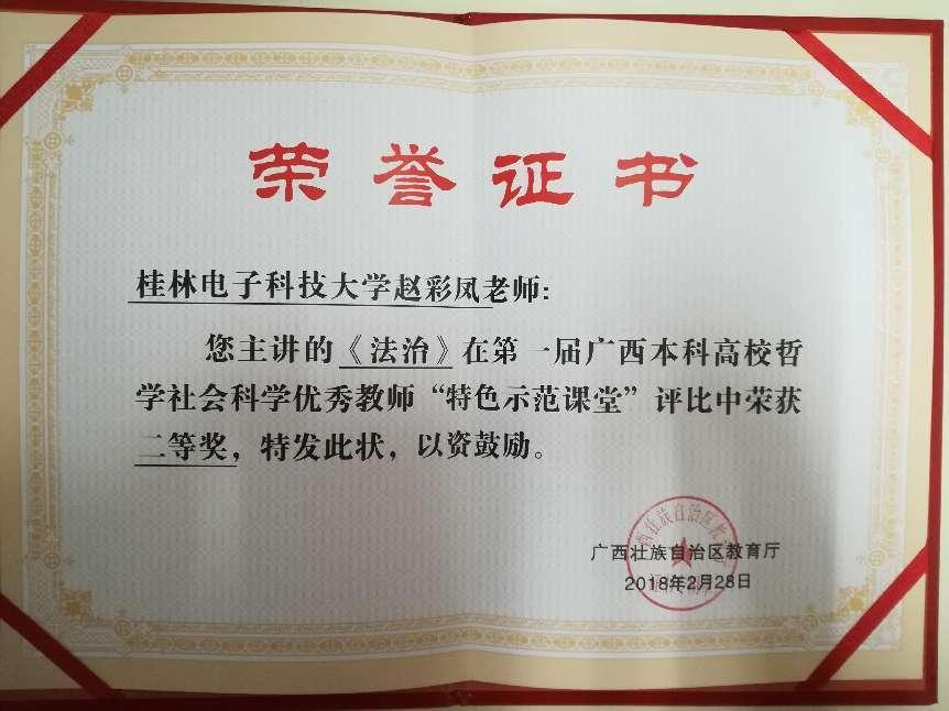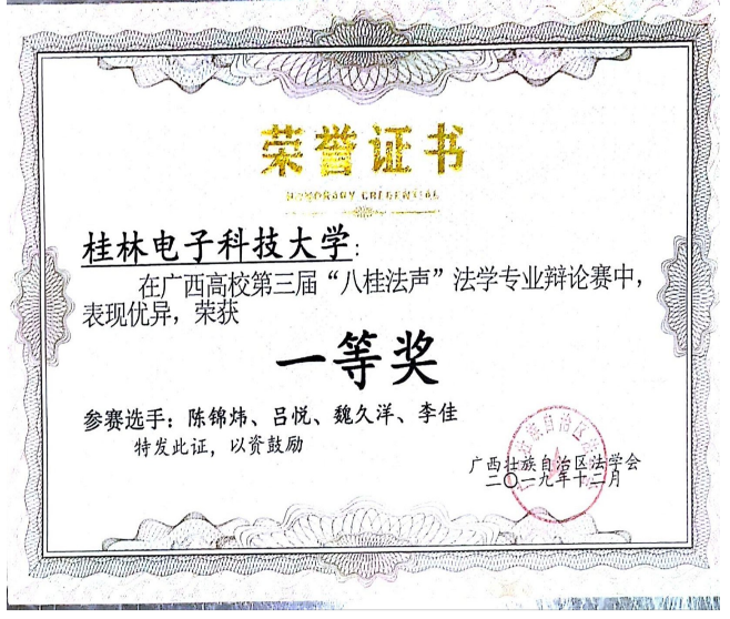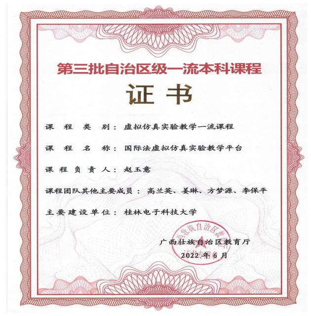 图 5 第一届广西本科高校哲学社会科学优秀教师“特色示范课堂”二等奖 回眸奋进路成绩斐然映初心,展望新征程踔厉奋发向未来 纵观学院十余年发展历程,正是在学校的正确领导和高度重视下,学院从自力更生、边缘挣扎求存的创立阶段逐步进入了外联合作、不断壮大的新时期,并能主动为学校发展和社会服务贡献力量,在教学和科研工作各方面取得了显著的成绩。学院将总结经验、增强信心、汇聚力量、明确方向,紧紧围绕“十四五”发展规划,团结全院师生,持续深化落实校院两级管理改革,强化部门间沟通合作,把握学校理工特色优势和时代机遇、开拓进取,砥砺前行,在推动法律与科技相融合,强化知识产权运用等方面,创新人才培养模式,以科学研究服务地方法治和知识产权建设,为学校早日建设成电子信息特色鲜明的国内高水平大学作出新的贡献! |