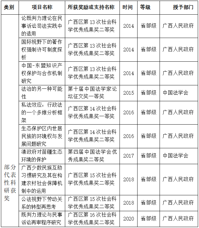 科学研究成果实现新突破 学院积极营造潜心钻研、创新进取的科学研究氛围,在理论研究、成果推广和科研育人等方面均取得了显著的成绩。2012年以前,学院共承担国家社科基金项目2项;截至2022年,学院共承担国家社科基金项目13项,十年内增加了11项(含国家社科重大项目子课题1项);2014年以来,学院共有22项成果获得广西社科优秀奖或中国法学会优秀奖,其中获得广西优秀社会科学成果奖一等奖1项,实现了学校广西社会科学优秀成果一等奖零的突破!