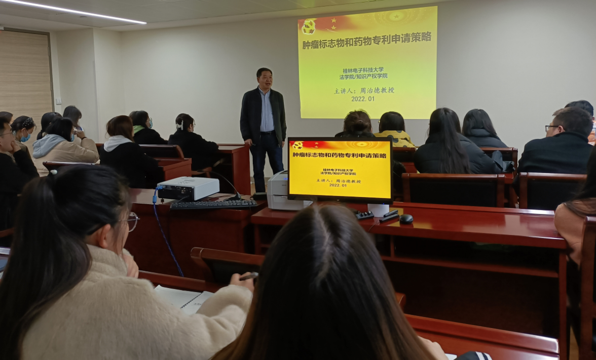 2022年1月17日,周治德专利分析团队受广西医科大学“国家生物靶向诊治国际联合研究中心”邀请,在广西医科大学科技楼开展了“肿瘤标志物和药物专利申请策略”专题讲座。