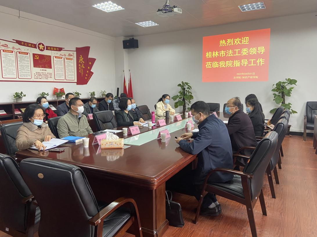 2022年4月1日上午,桂林市人大法工委主任徐强,副主任张海云等一行4人到法学院/知识产权学院就立法基地建设、研学合作等事宜开展调研。会议由法学院/知识产权院长高兰英主持,副院长彭俊、赵玉意,校政策法规室主任贾媛媛及学院部分教师参加。