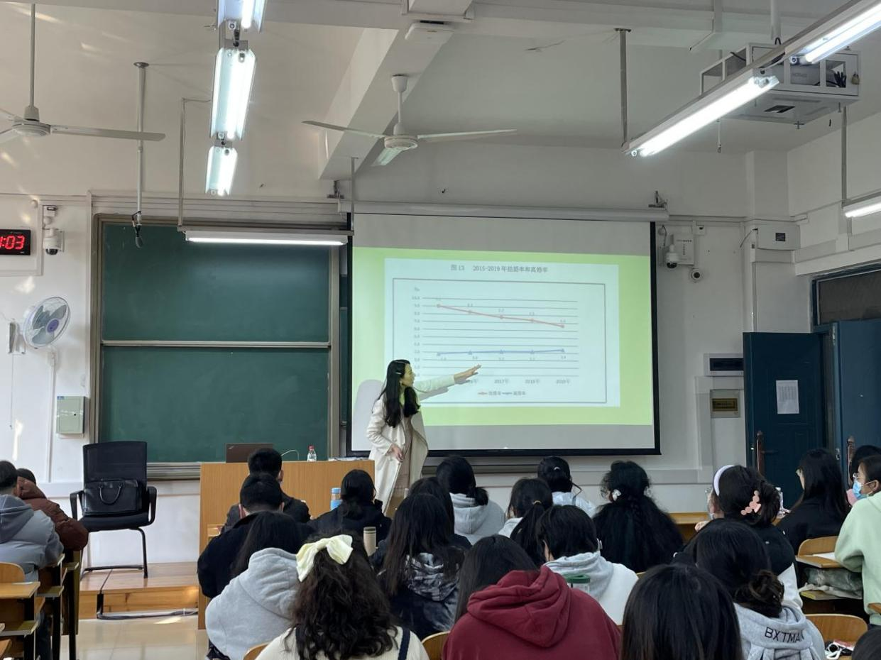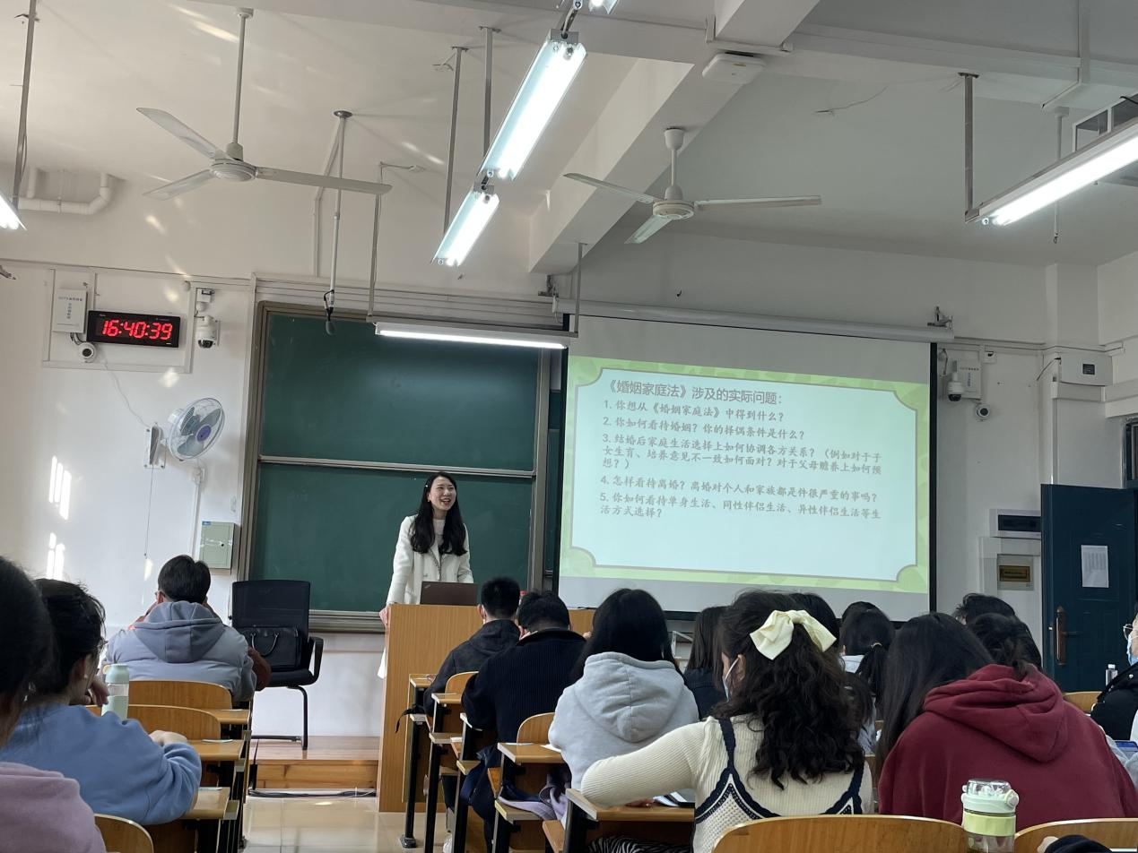 当天下午第七节课,在第2教学楼201教室,法学系教研室部分教师共同观摩了赛铮老师的《婚姻家庭法》课程。赛老师课堂采用问卷调查的方式,了解学生的学习目标,激发学生的学习兴趣。课堂通过图表的形式分析了近年来的结婚率和离婚率;通过引用伯特兰•罗素对幸福婚姻条件的理解,启发学生对婚姻家庭法的思考。赛老师的讲解由浅入深、由表及里,整个课程重点突出、内容详尽,学生参与度高,课堂气氛活跃。