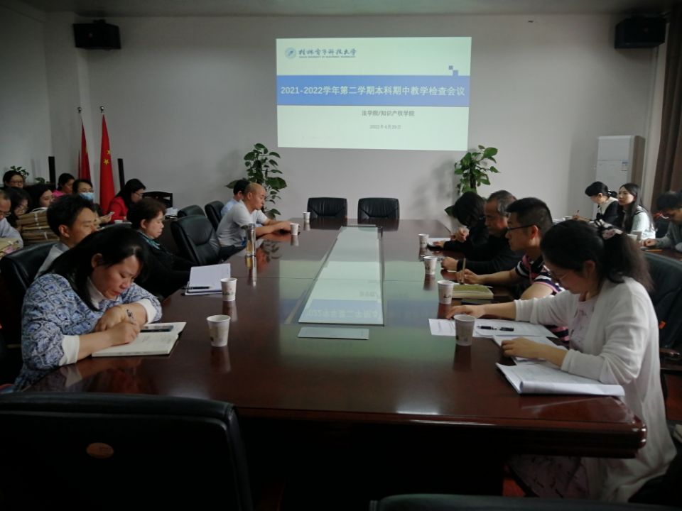 2022年4月29日,法学院/知识产权学院在会议室召开2021-2022学年第二学期本科期中检查大会。会议由赵玉意副院长主持,蒋小斌书记、高兰英院长、程飞副书记和全体教师参加。