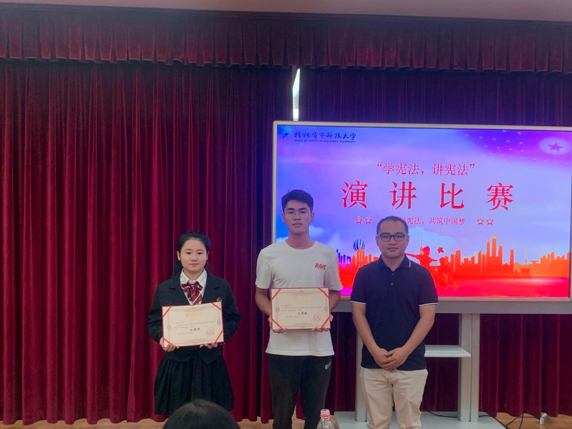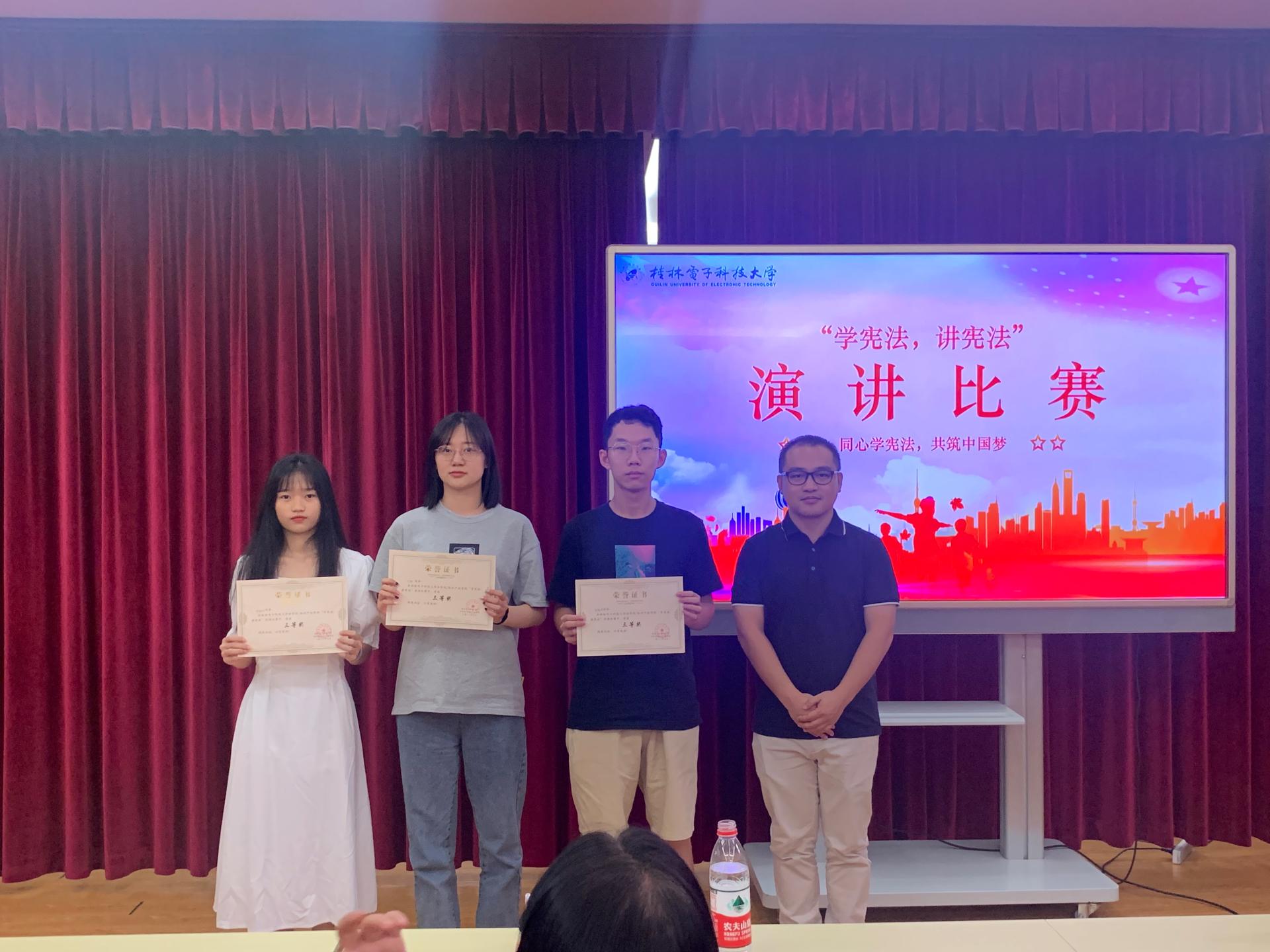 比赛现场,各位选手沉着自信,侃侃而谈,围绕自身经历和时政热点,讲宪法故事,谈宪法认识,论宪法精神,道出自己的独特见解。经过激烈角逐,来自法学院/知识产权学院李泓同学获得一等奖,韦唯、吴忠辉2名同学获得二等奖,石祖兴、万励、邓钰兰3名同学获得三等奖。优秀选手将代表学校参加省教育厅比赛。