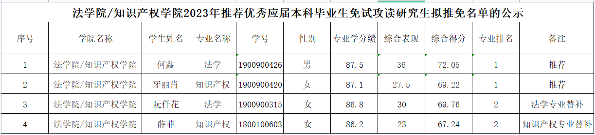 关于法学院/知识产权学院2023年推荐优秀应届本科毕业生免试攻读研究生推免名单的公示